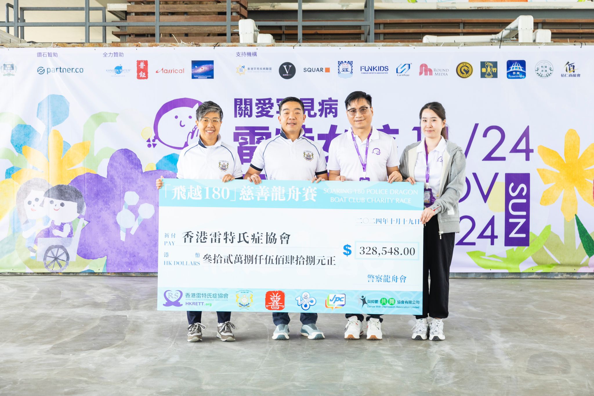 今年度香港雷特氏症協會成為2024年警察龍舟會舉辦的「飛越180」慈善龍舟賽其一受惠機構。活動開幕禮上邀請警察龍舟會代表舉行頒發大支票捐款儀式,感謝各界對罕見病機構的支持與捐款。